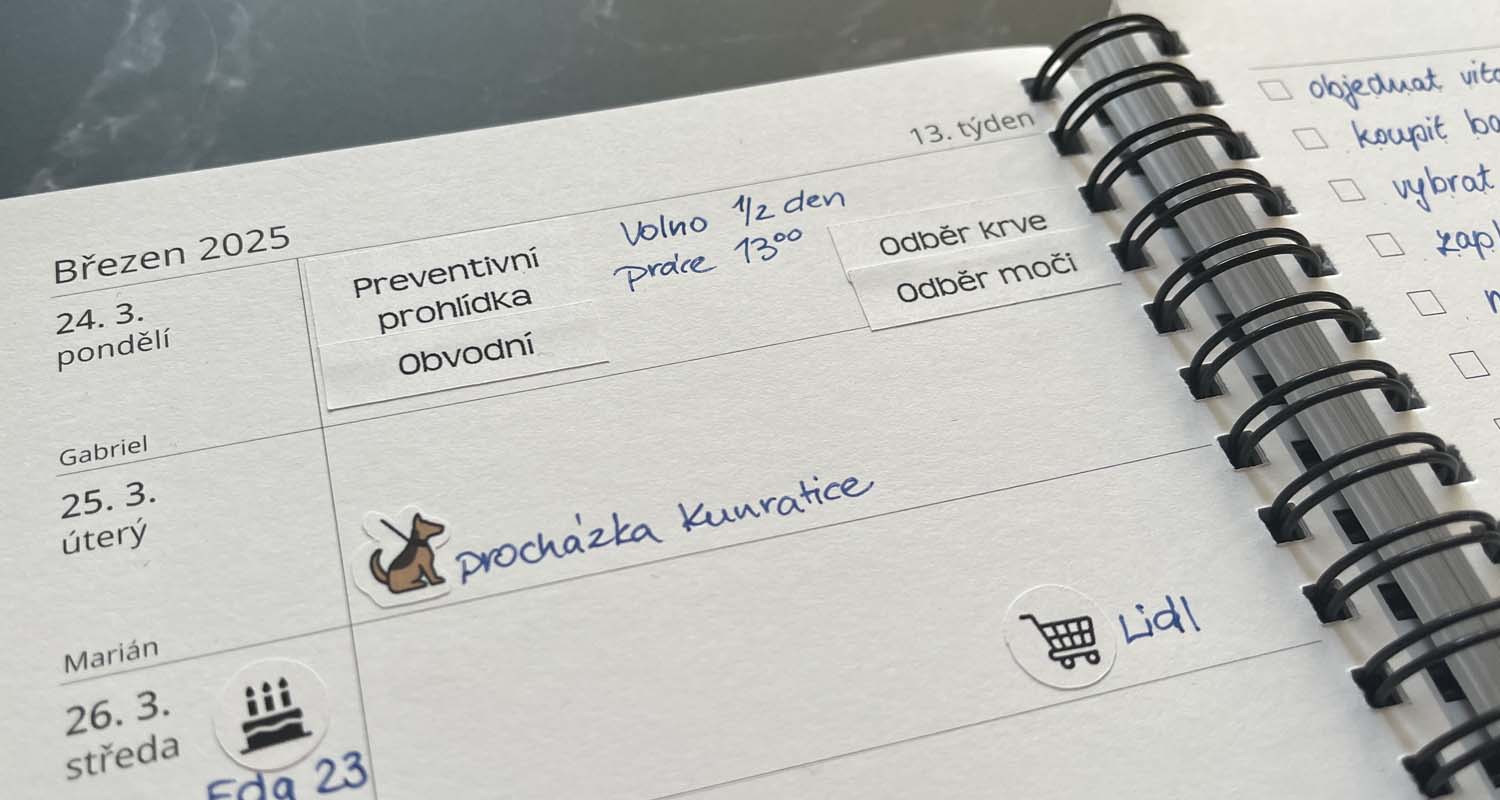 - Připomínky na léky a vitamíny – pokud užíváte něco pravidelně, může vám pomoci vizuální kontrola v diáři.