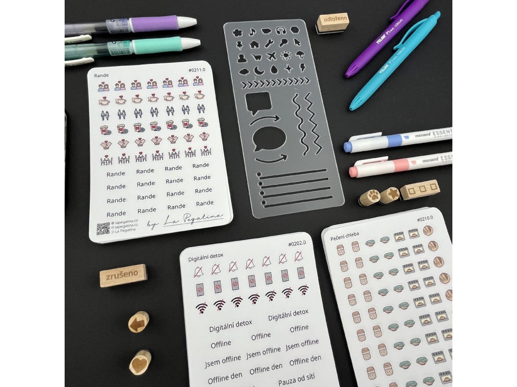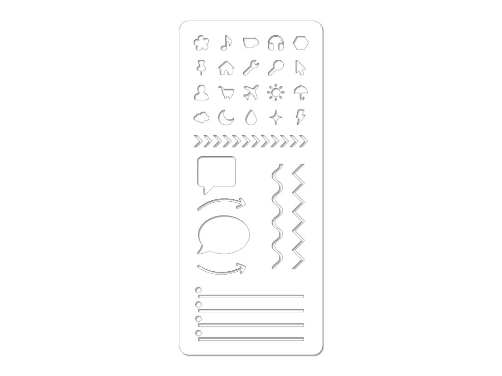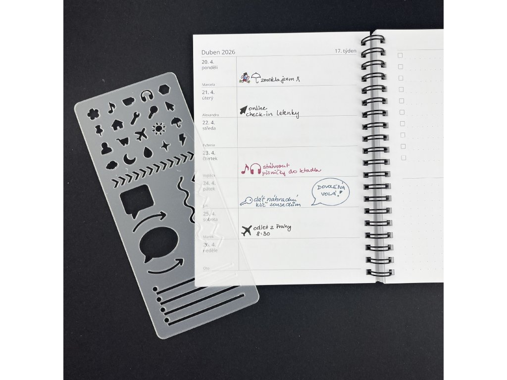 Šablona má univerzální rozměr 175 × 75 mm, takže perfektně pasuje do diářů velikosti B6 a snadno ji vložíte i do větších formátů. Je vyrobena z průhledného plastu o tloušťce 0,5 mm, který je pevný, odolný a přitom dostatečně tenký pro pohodlné používání. Díky průhlednosti vždy přesně vidíte, kam tvar umisťujete, žádné křivé linky ani posunuté ikonky.
