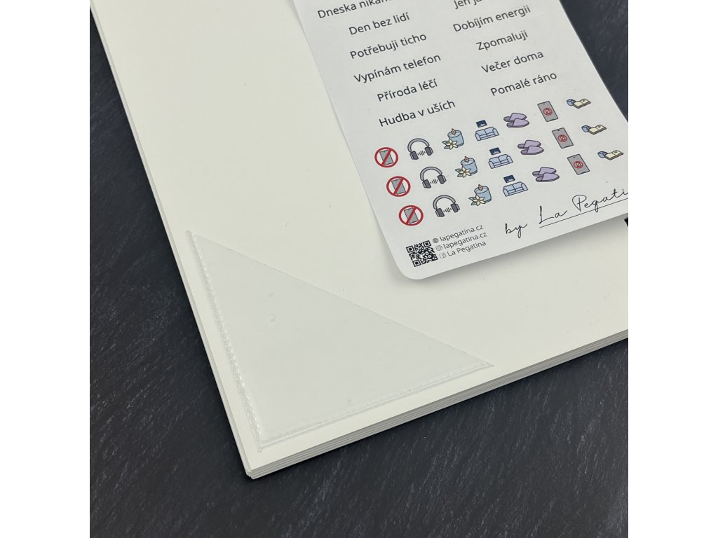 Roh stačí nalepit do rohu stránky a vznikne praktická kapsa, do které snadno zasunete poznámky, které nechcete ztratit, ale zároveň je nepotřebujete pevně lepit nebo zapisovat natrvalo.