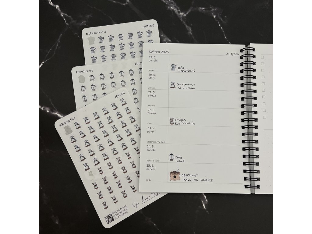 Vizuálně propojí vaše plánování s oblíbenými denními rituály a dodá mu příjemný osobní dotek. Doplnit svůj diář můžete i samolepkami Káva, Kafe nebo Cold brew.