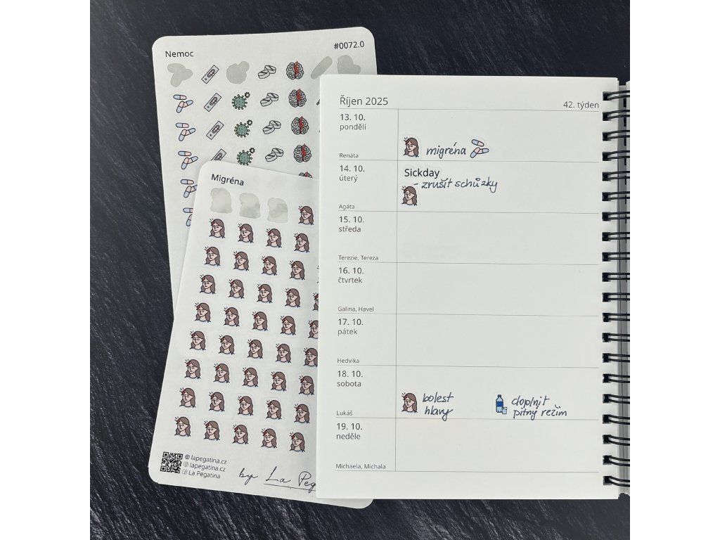 Samolepky Migréna jsou vhodné pro každodenní plánování, dlouhodobé sledování zdravotních potíží i pro lepší komunikaci s lékařem díky přehledným záznamům v diáři.