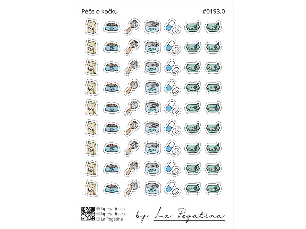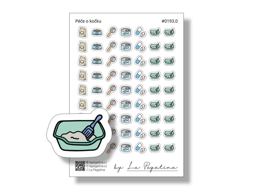 Samolepky Péče o kočku pomohou udržet pořádek ve všech pravidelných i nepravidelných povinnostech spojených s kočičím životem. Ilustrace krmení, čištění záchodu, pelíšku nebo odčervení vám usnadní každodenní plánování.