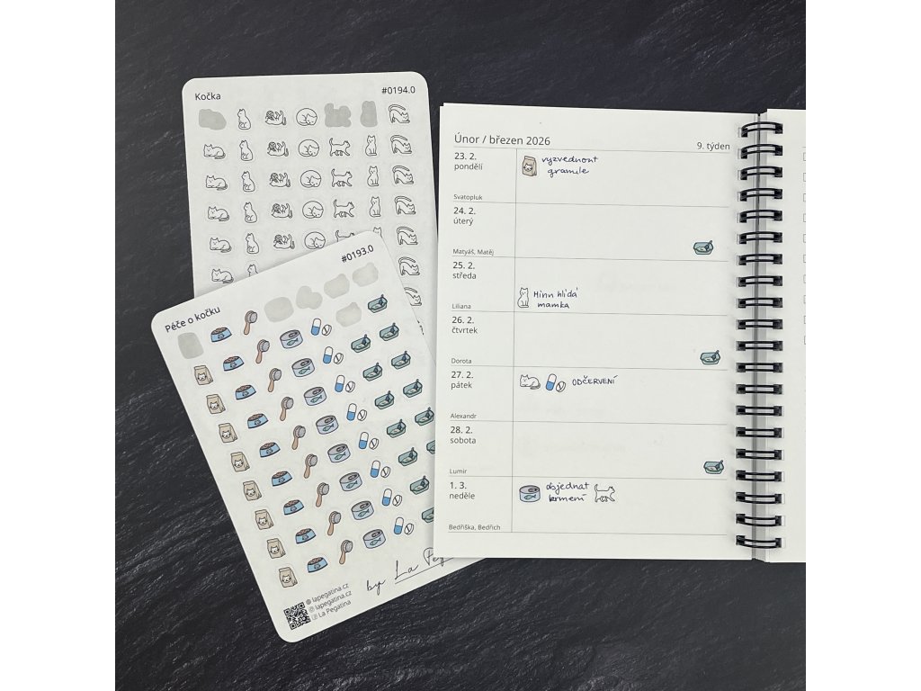 Tyto samolepky jsou skvělým pomocníkem pro každého, kdo chce mít péči o kočku jasně a jednoduše zanesenou ve svém diáři. Malé ikonky — krmení, konzerva, pelíšek, kočičí záchod, odčervení a miska s jídlem — umožňují rychle označit všechny důležité úkoly a rutiny, které přispívají k pohodě vašeho mazlíčka.
