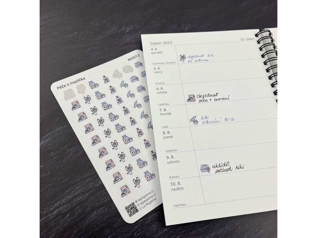 I když symbol tlapky nenavádí k tomu, že pečujete třeba o rybičky, na první pohled si uvědomíte, co znamená obrázek krmení ve vašem diáři. Pro pejsky a kočičky máme i vlastní samolepkové archy.