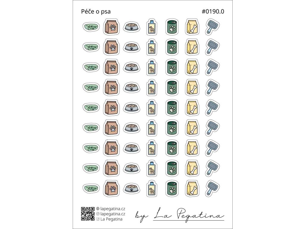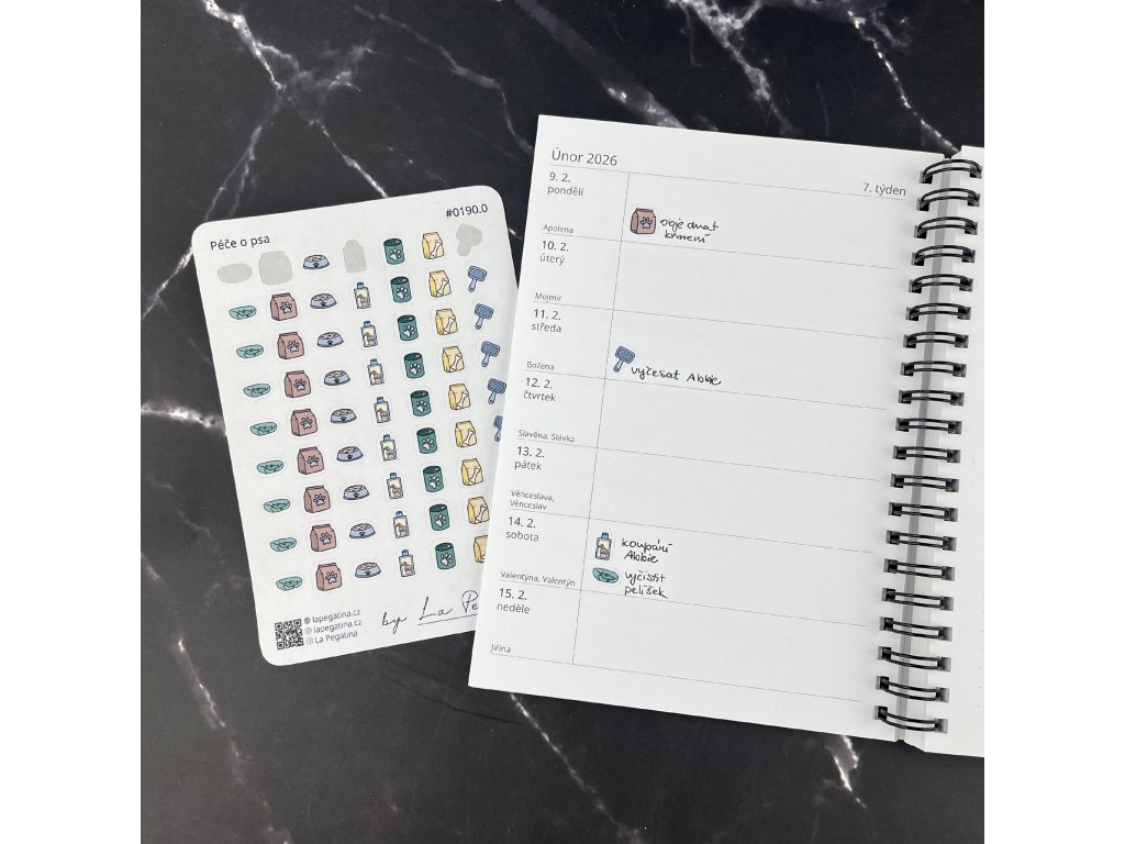 Samolepky Péče o psa pomohou udržet přehled o pravidelných povinnostech kolem vašeho mazlíčka. Malé ilustrace krmení, pamlsků, česání nebo koupání zpřehlední péči o psa v každodenním plánování.