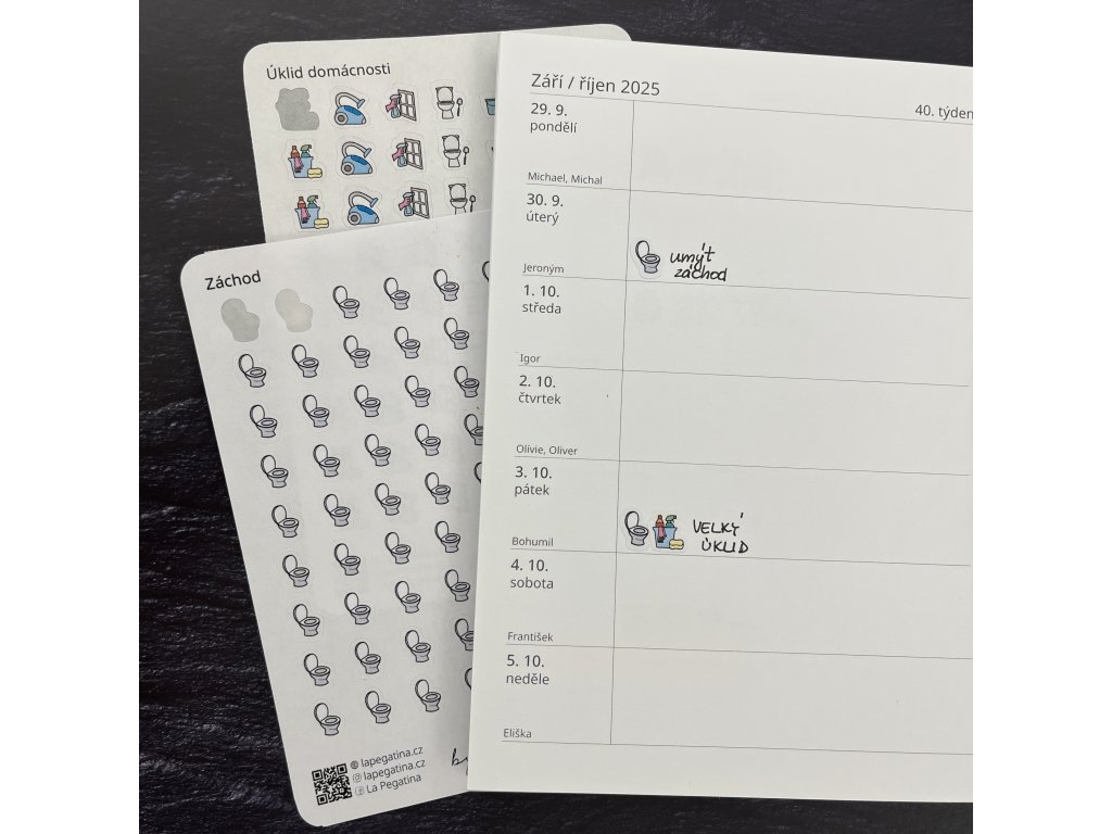 Samolepky Záchod slouží k rychlému a srozumitelnému označení úklidu, domácích povinností i drobných „realistických“ poznámek v diáři, s lehkou nadsázkou, která neurazí.